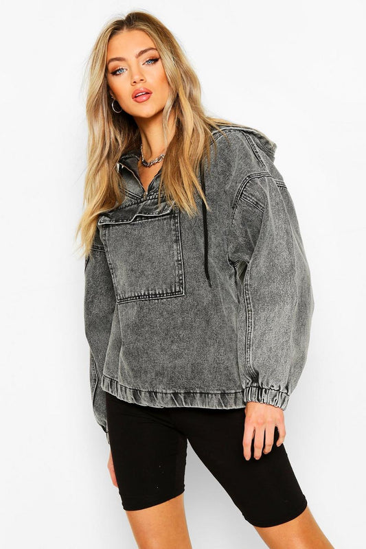 HOODED ACID WASH PULL OVER DENIM JACKET